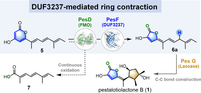 以α,β-不饱和γ-内酯环为特征的γ-亚烷基丁烯内酯是广泛存在于植物与微生物次生代谢产物中的活性结构单元,但其生物合成途径仍尚未得以解析。研究团队在研究一类具有γ-亚烷基丁烯内酯与环戊烷双环骨架的新颖曲霉代谢产物生物合成过程中,成功揭示了一条具有普适性的δ-取代γ-亚烷基丁烯内酯生物合成途径。该生合过程中,由氧化酶PesD与DUF3237家族酶PesF构成的“双酶级联体系”可通过“原子删除”实现δ-内酯至γ-内酯的缩环过程,是一种化学反应中前所未见的碳骨架编辑机制。